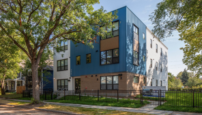 Many of these buildings aren’t huge; they usually have between four and twenty units, and consist of either townhome-style complexes or multiplex-style buildings. The following two figures provide examples of typical projects: Fig. 2 shows ten new townhome units in Northeast Minneapolis, and Fig. 3 shows a six-unit building that is one of the Minneapolis Public Housing Authority’s 16 new small-scale housing developments.
